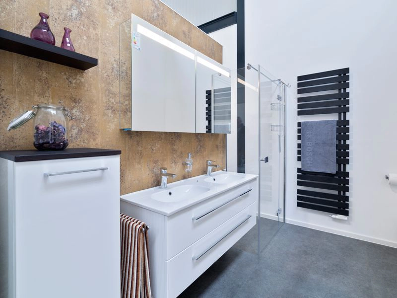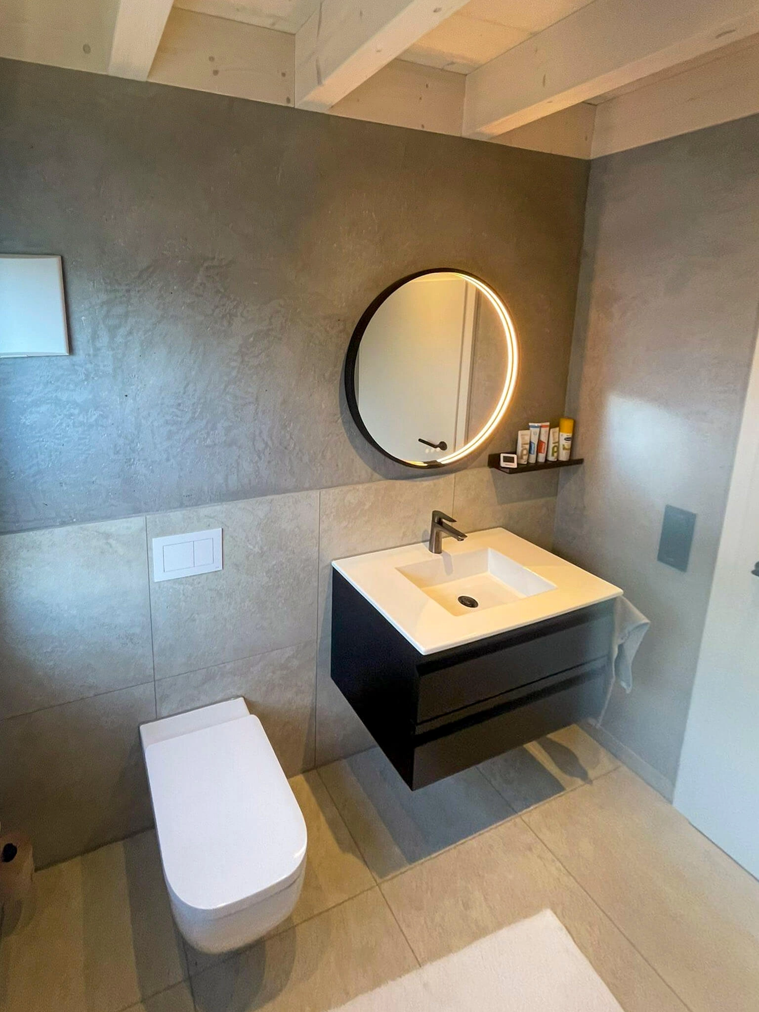 Fugenlose Wandverkleidungen wie RenoDeco sehen nicht nur elegant aus, sondern lassen sich auch besonders leicht reinigen. Schmutz und Schimmel haben keine Chance – ideal für ein dauerhaft gepflegtes Bad.
