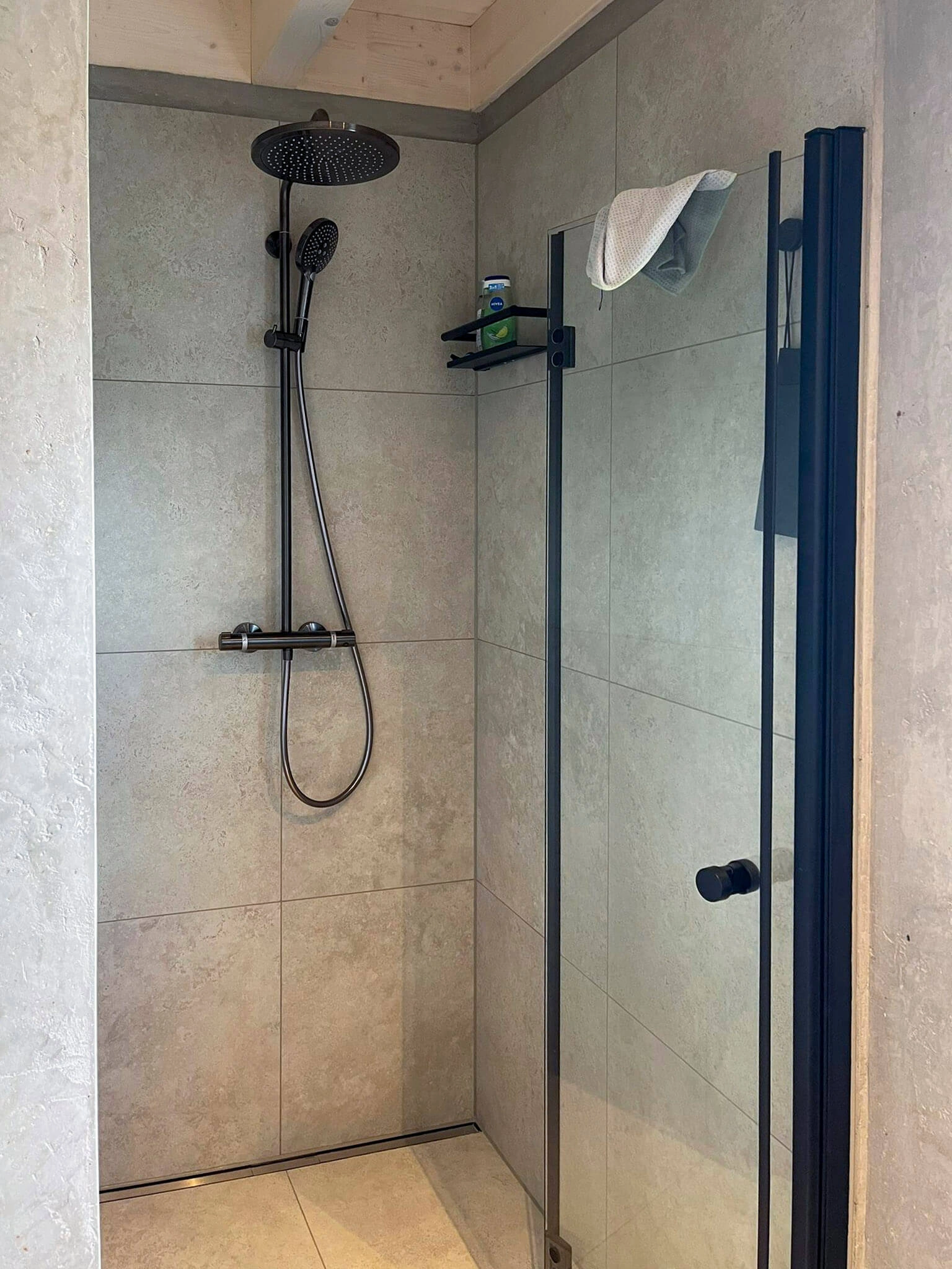 Die Dusche ist ohne Schwelle direkt begehbar und mit einer großzügigen Kopfbrause ausgestattet. So bietet sie maximalen Komfort und Sicherheit – auch für Menschen mit eingeschränkter Beweglichkeit.