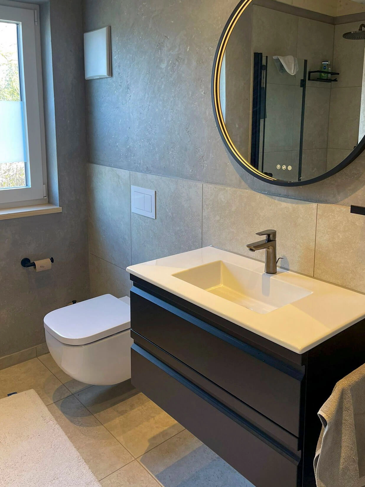Ein stilvoller Waschtisch mit Unterschrank, Spiegelschrank und zusätzlichem Hochschrank sorgt für viel Stauraum und Ordnung. Abgerundet wird das neue Bad durch ein wandhängendes WC, das den luftigen Gesamteindruck unterstreicht. Das Ergebnis: ein harmonisch gestaltetes, funktionales Bad, das Komfort und Ästhetik perfekt verbindet – ideal für jede Lebensphase.