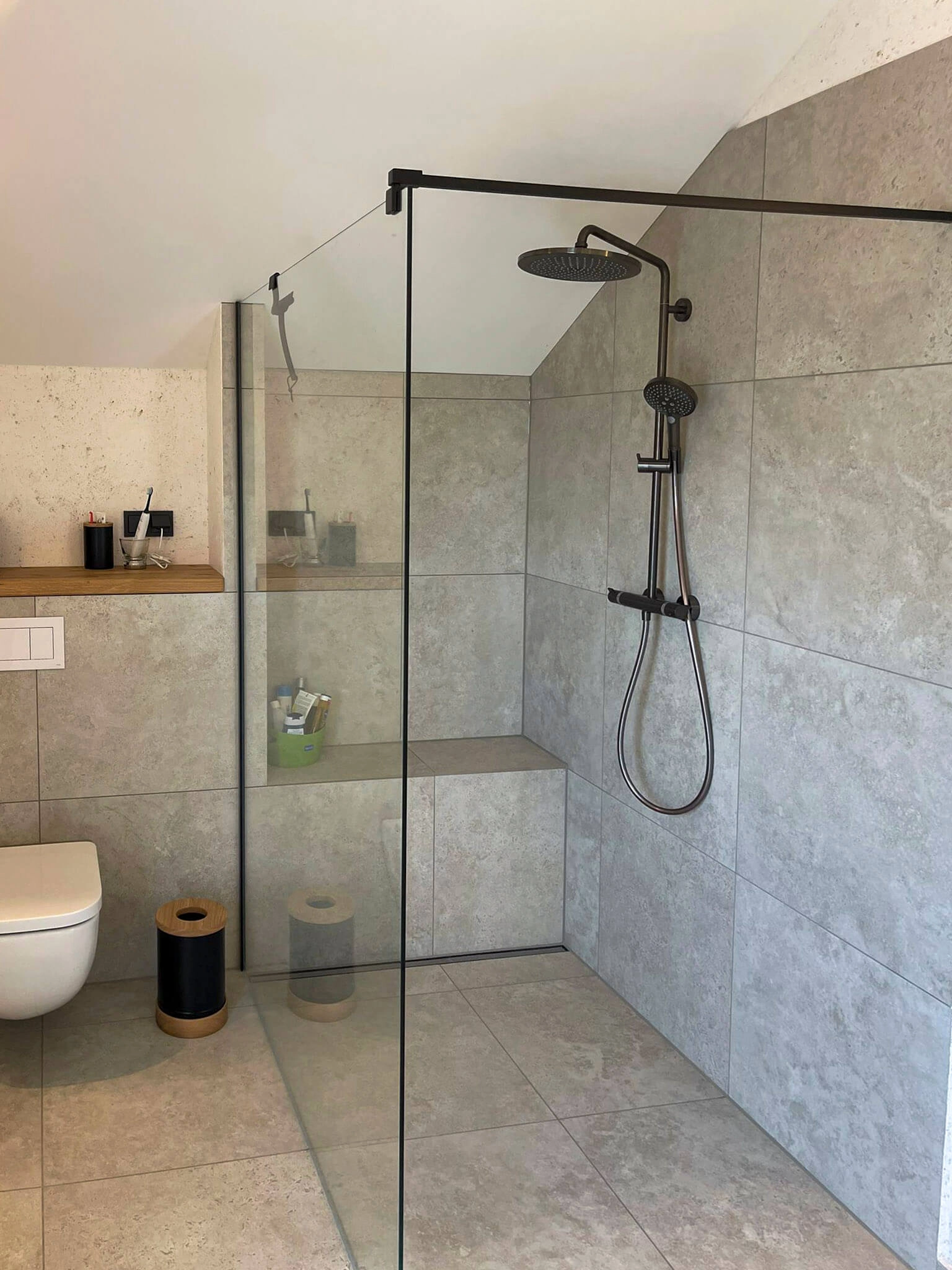 Im Raum Steinfurt wurde ein ca. 9 m² großes Badezimmer vollständig modernisiert und in ein komfortables, barrierearmes Duschbad verwandelt. Die besondere Herausforderung: eine Dachschräge, die bei der Planung optimal berücksichtigt wurde. Das Herzstück bildet die großzügige, schwellenlose Dusche mit eleganter Kopfbrause und pflegeleichter RenoDeco-Wandverkleidung – komplett fugenlos für ein modernes, hygienisches Raumgefühl.