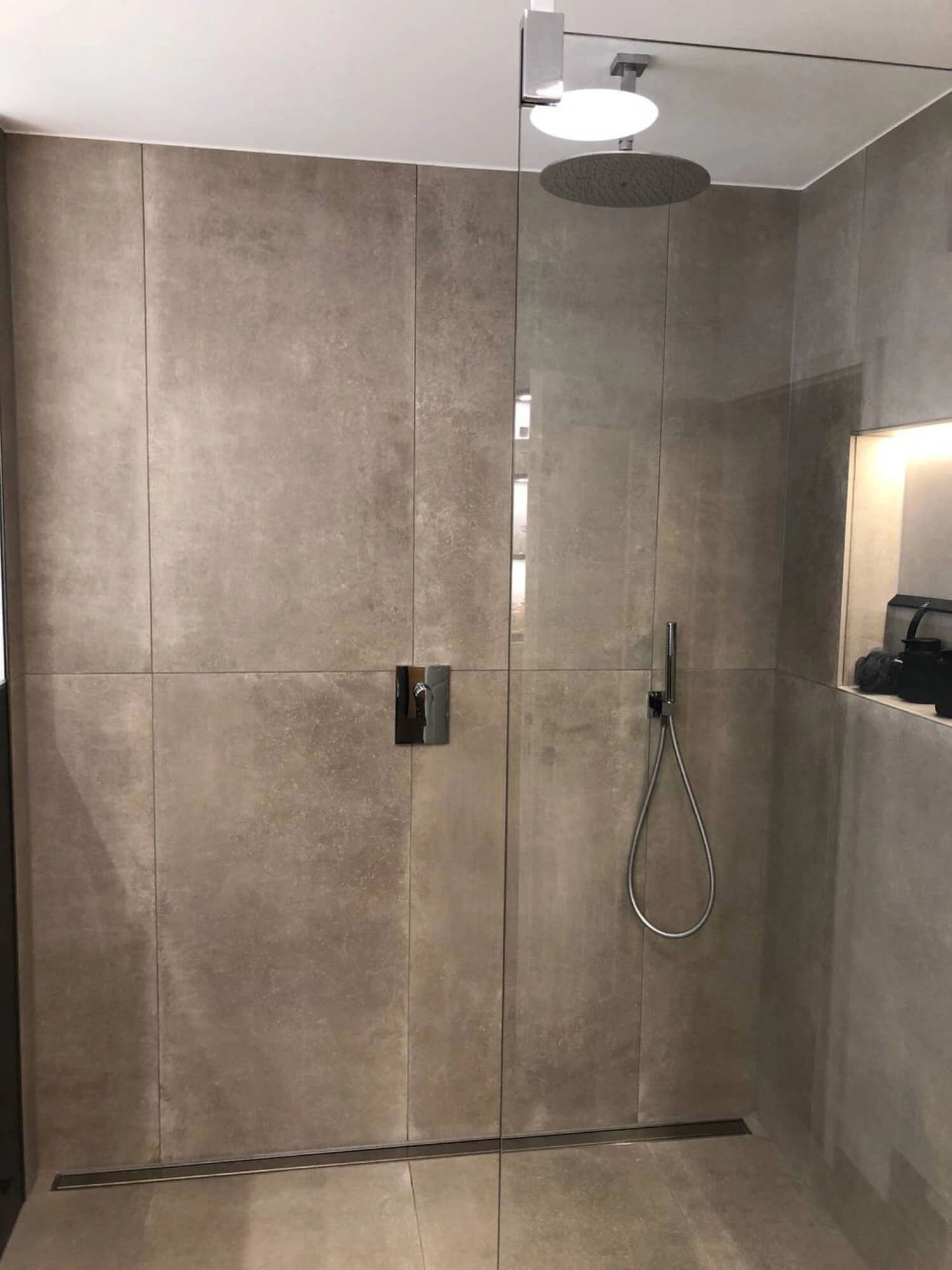 Fugenlose Wandverkleidungen wie RenoDeco sehen nicht nur elegant aus, sondern lassen sich auch besonders leicht reinigen. Schmutz und Schimmel haben keine Chance – ideal für ein dauerhaft gepflegtes Bad.