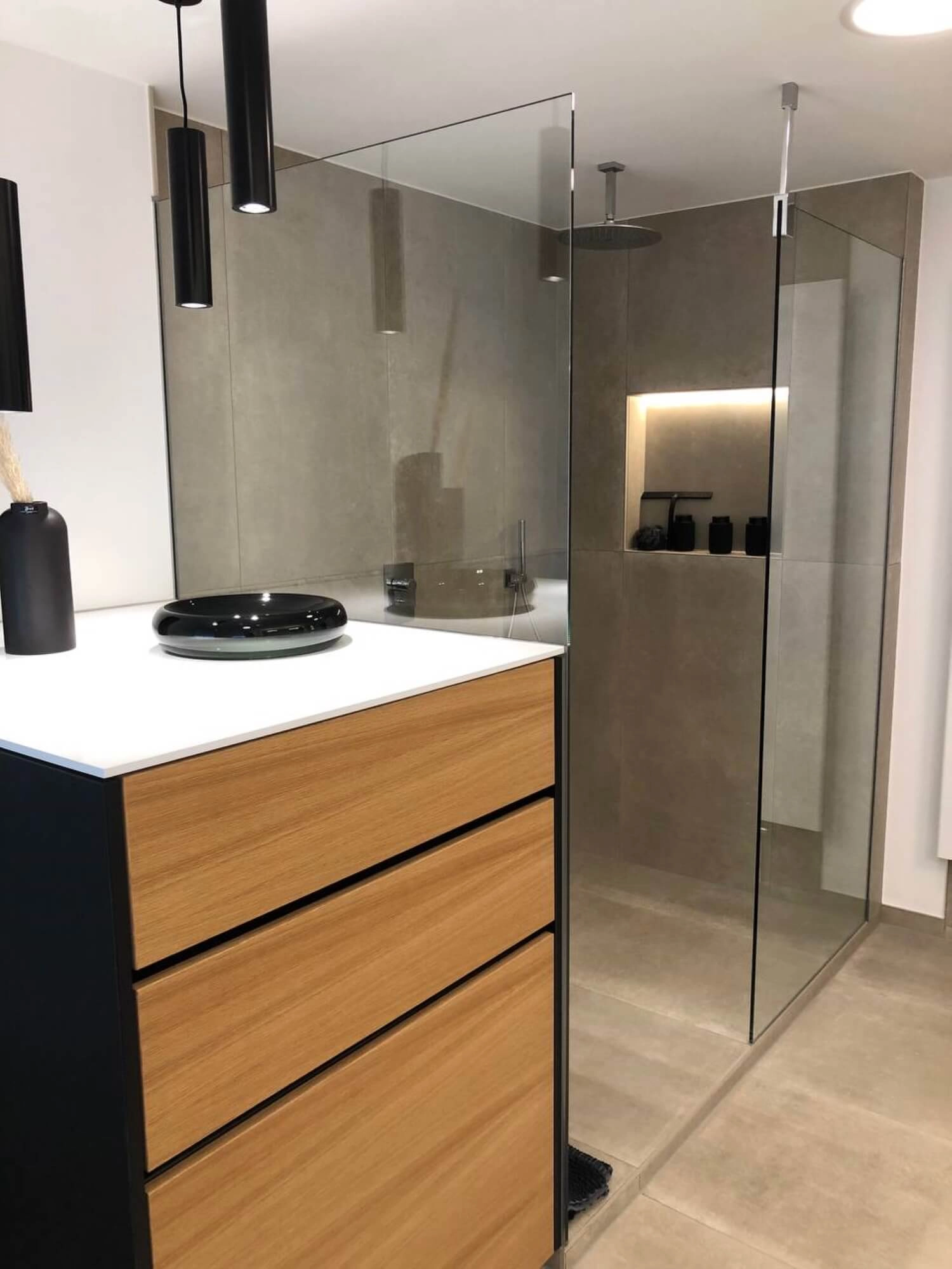 Im Mittelpunkt steht eine begehbare Dusche mit bodengleichem Einstieg, Nische zur Ablage sowie Unterputz-Armaturen von Cristina, ergänzt durch Kopf- und Handbrause von Optima. Die elegante Waschtischanlage mit Doppelwaschbecken ist mit Armaturen von Catalano ausgestattet. Die Badmöbel wurden individuell vom Tischler gefertigt, was dem Raum eine persönliche Note verleiht. Komplettiert wird das Ensemble durch ein wandhängendes WC und eine hochwertige Glasabtrennung von HSK.