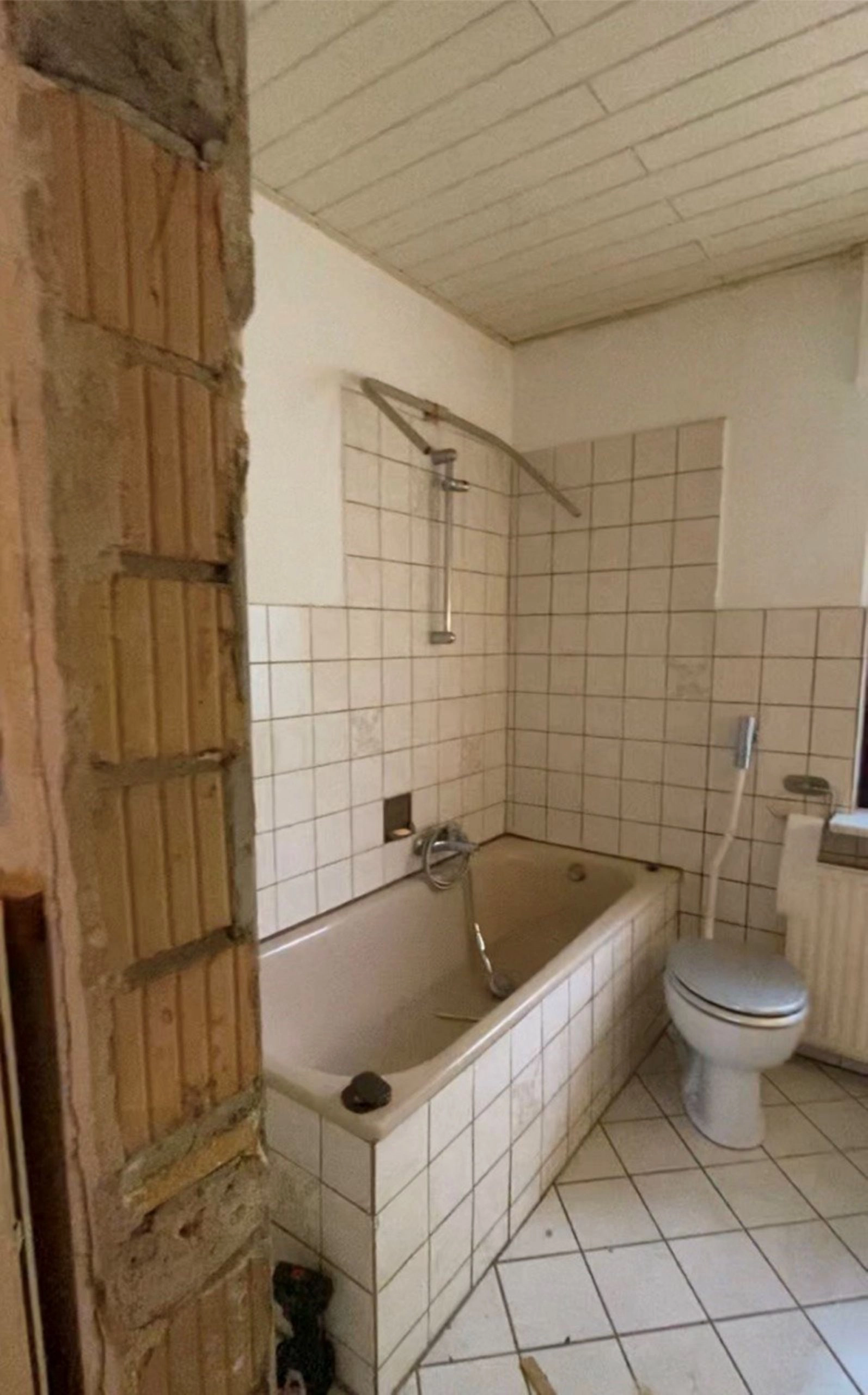 Im Raum Steinfurt wurde ein ca. 9 m² großes Badezimmer vollständig modernisiert und in ein komfortables, barrierearmes Duschbad verwandelt. Die besondere Herausforderung: eine Dachschräge, die bei der Planung optimal berücksichtigt wurde. Das Herzstück bildet die großzügige, schwellenlose Dusche mit eleganter Kopfbrause und pflegeleichter RenoDeco-Wandverkleidung – komplett fugenlos für ein modernes, hygienisches Raumgefühl.