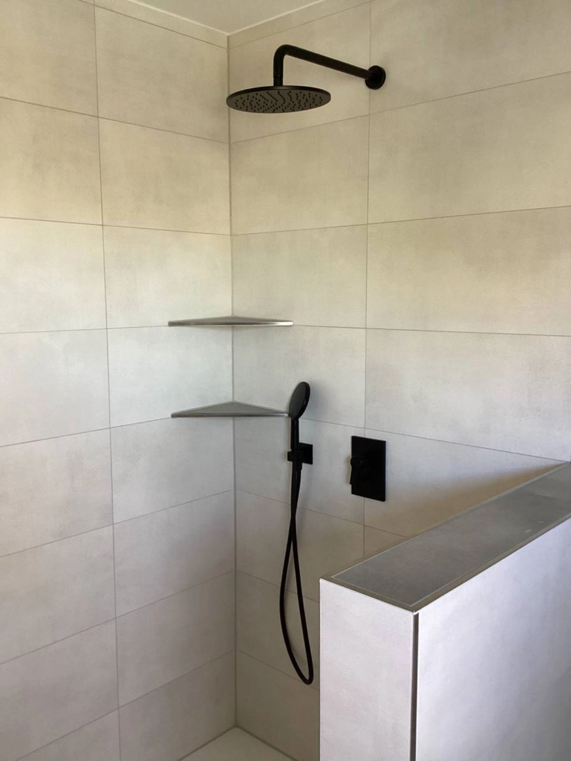 Die Dusche ist bodengleich begehbar, verfügt über eine großzügige Ablagenische und ist mit komfortabler Unterputz-Armatur sowie Kopf- und Handbrause ausgestattet – ideal für jede Lebenssituation.