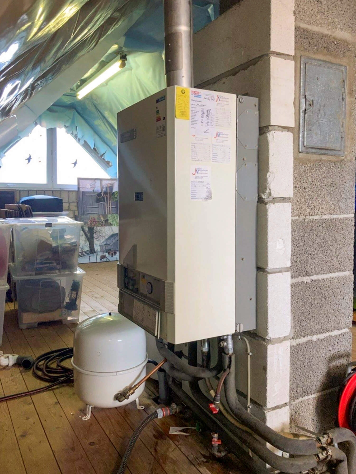 Die Arbeiten umfassten zusätzlich die Sanierung der Abgasanlage im bestehenden Kamin, sodass alle Anforderungen an Sicherheit und Energieeffizienz erfüllt sind. Die Regelung der Anlage erfolgt über die Bosch CW400, ein komfortables und präzises Steuerungssystem. Die neue Anlage wurde an die vorhandenen Leitungen angebunden – schnell, sauber und zukunftssicher.
